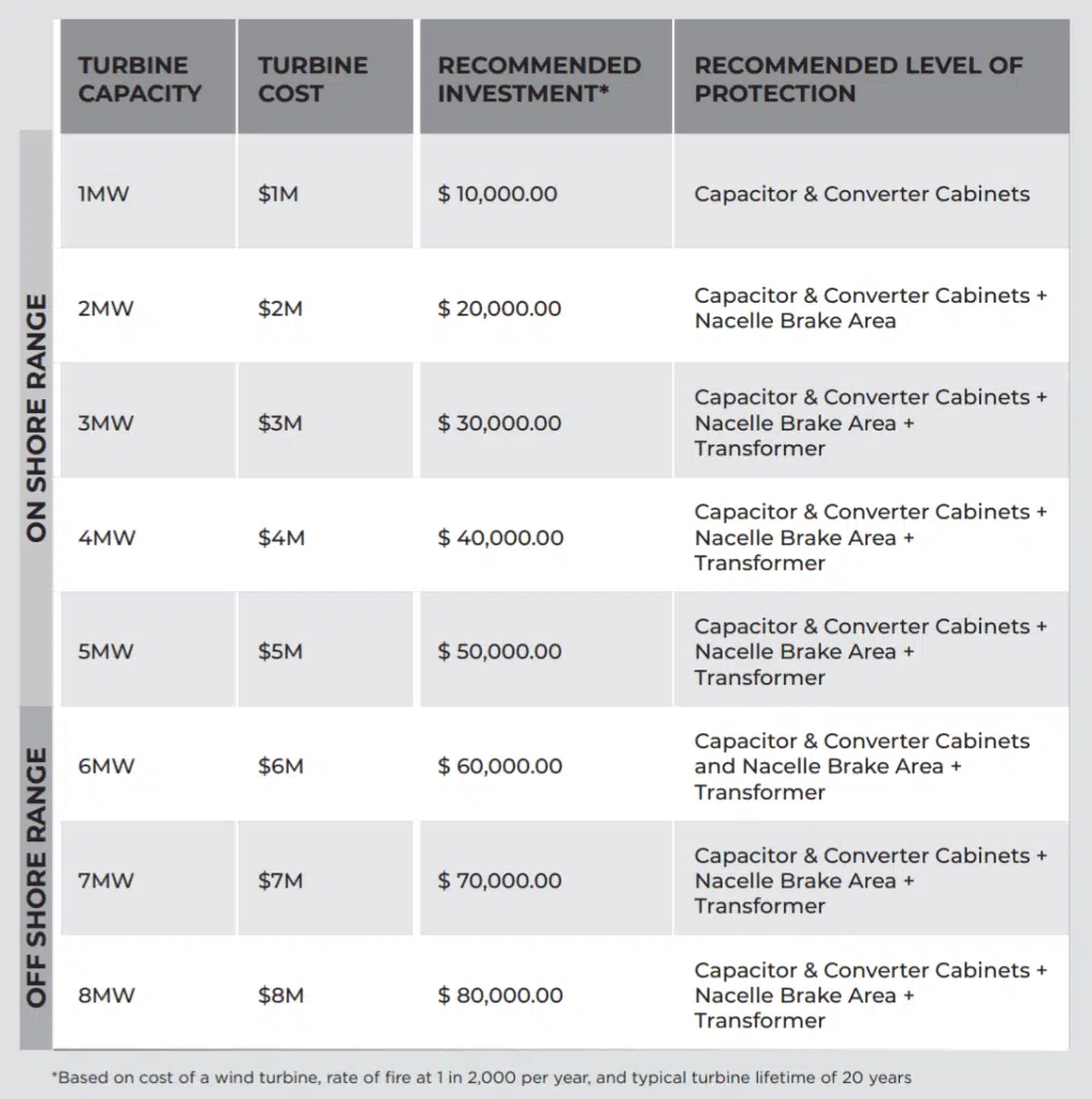 Sometimes having peace of mind is worth more than any cost-benefit analysis may show. Below is a recommended investment guide for protecting your wind turbines, based on turbine capacity taken from The Complete Guide to Wind Turbine Fire Protection.