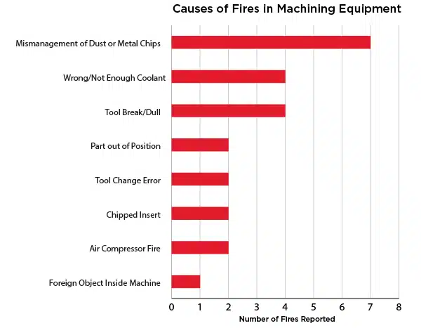 Our research shows that the leading cause of machine shop fires is mismanagement of dust and/or metal chips. Our findings were gathered from reports of fire incidents in the news, on social media, and interviews with our customers, who have had fires suppressed by CNC fire suppression systems.