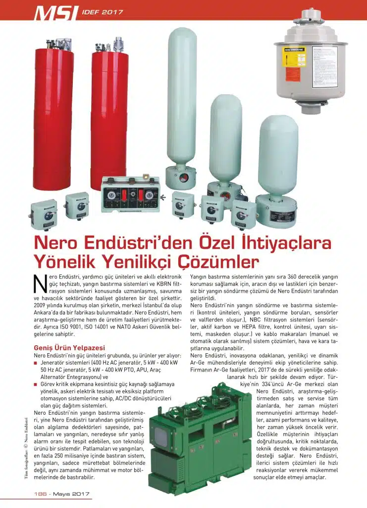 Nero Endüstri, Türkiye'nin önde gelen savunma sanayi üreticilerinden biri olarak yangın söndürme, KBRN, lazer uyarı sistemleri, sis havanı ve askeri jeneratörler geliştirmektedir.