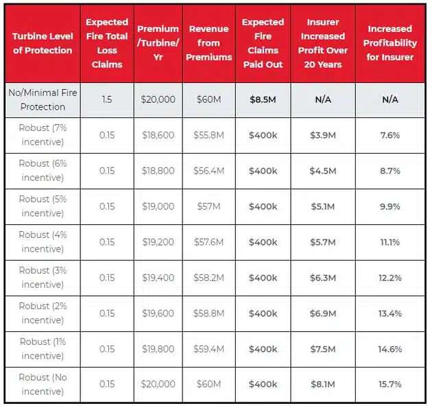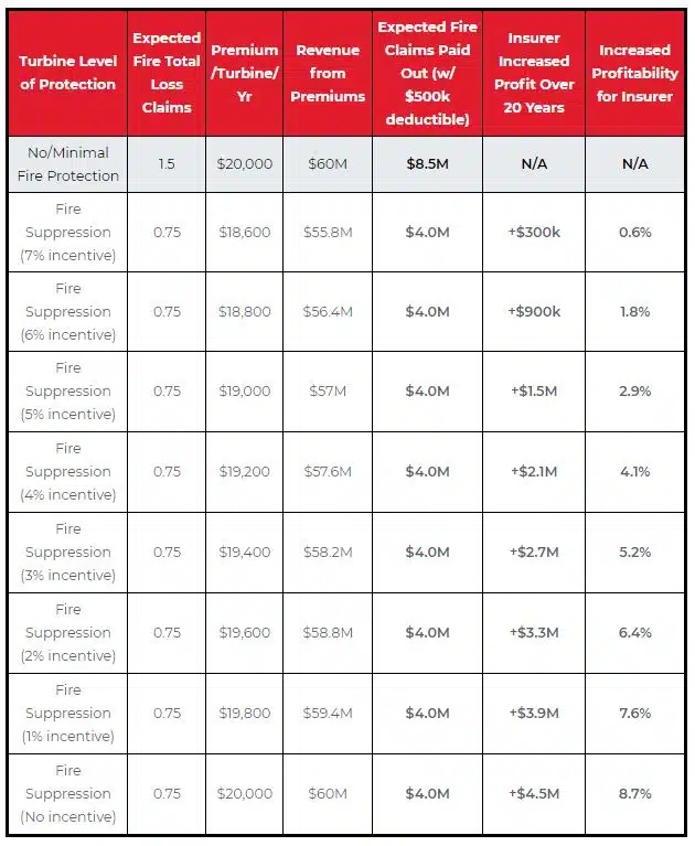 If you are installing robust fire protection, including fire detection and suppression, arc flash, and lightning protection systems, then you are minimizing your risk while reducing exposure for large payouts for the insurer. If they give you no incentive for adding these risk mitigation efforts, then they are potentially improving their profitability by $8.1M or 15.7% over a 20-year lifespan of your turbines. By giving a 7% incentive on your policy, you see reductions in your premiums, and they could still be netting an extra $3.9M or 7.6% in profit over a 20-year lifespan.